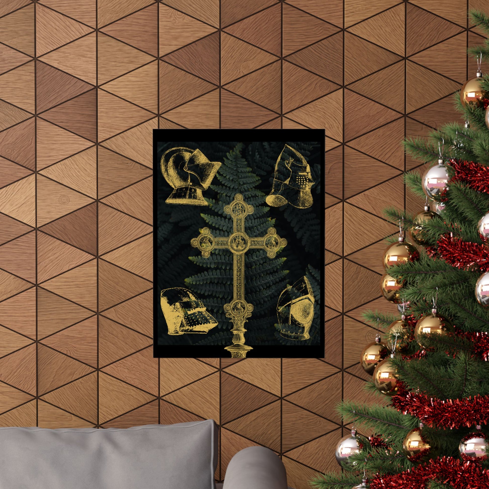 Old-world reverence meets verdant mystery in this matte vertical poster. A gilded cross and medieval helmets. The matte finish soaks up light, giving each gold accent a soft, tactile presence while the dark foliage recedes into quiet depth. Hang it in a reading nook, study, or hallway to bring an antique, contemplative mood—like discovering a relic tucked away in a botanist’s conservatory. It feels both historic and quietly botanical, offering a subtle conversation piece for homes that favor thoughtful, layered decor.