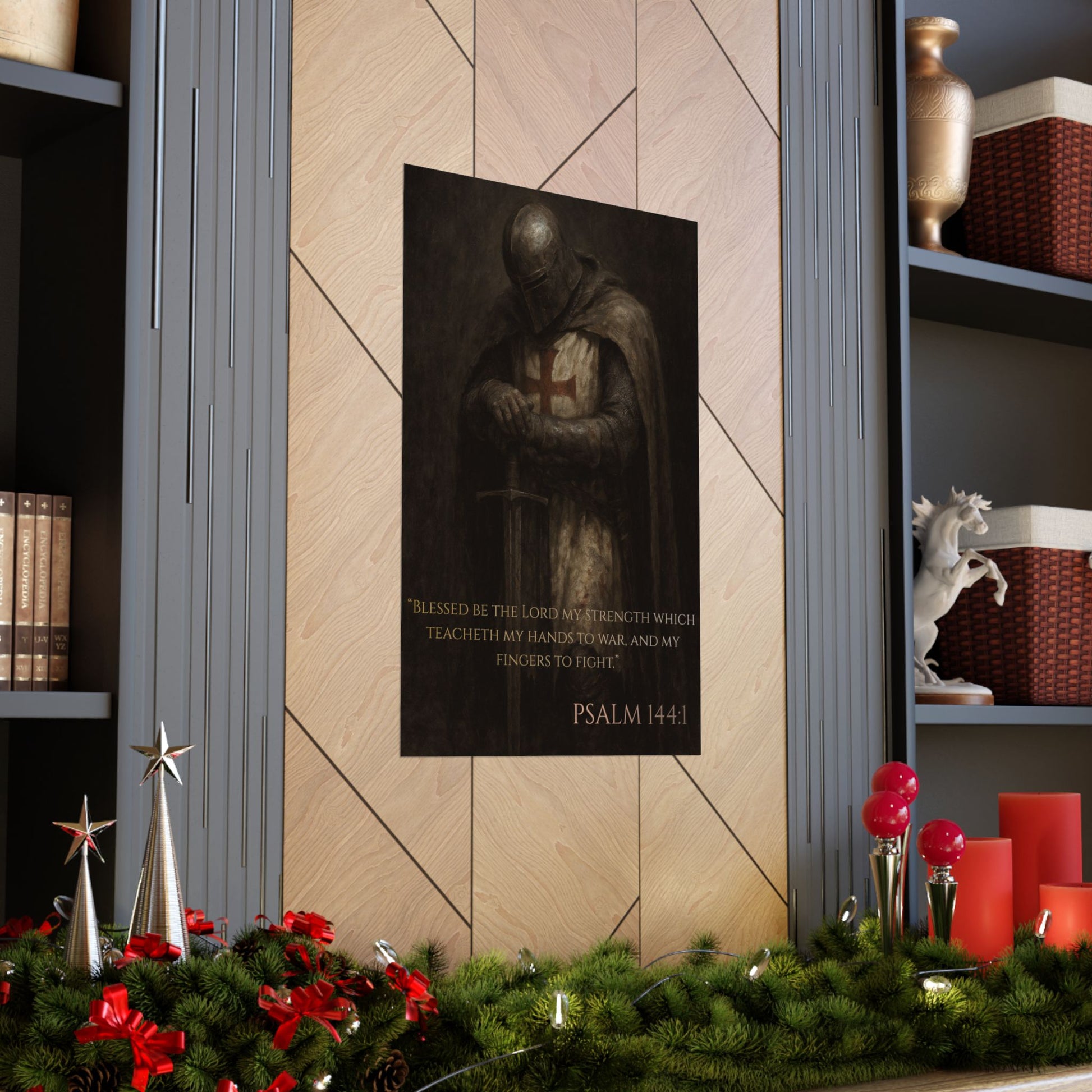 Elegant and powerful Templar Knight art print poster with Psalm 144:1 quote, perfect for adding a touch of historical charm to any room. Ideal for history enthusiasts, medieval fans, and religious art lovers. Great for decorating homes, offices, or classrooms, fitting perfectly into themed decor or as a unique gift for special occasions like birthdays or Christmas.